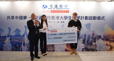 交通银行股份有限公司(“交通银行")于3月30日假交通银行香港分行私人银行中心举行「共享中国梦—交通银行香港大学生奖学计划」启动仪式,交通银行董事长牛锡明先生专程赴港出席并主持是次活动。香港特别行政区政府教育局副秘书长(学校发展及行政科)康陈翠华女士、中央人民政府驻香港特别行政区联络办公室教育科技部副巡视员张总明先生及香港直接资助学校议会主席招祥麒博士莅临出席并担任主礼嘉宾。 今年是香港回归祖国和香港特别行政区成立二十周年,为了鼓励香港中学生赴内地升学,增进了解国情,培养香港青年学生人才,交通银行发起「共享中国梦—交通银行香港大学生奖学计划」,资助本地中学毕业生到内地高校学习,推动内地与香港的文化交流及人才流通。交通银行委托香港直接资助学校议会,依据其在教育界的强大网络,邀请相关教育专家和社会知名人士等组成评选委员会,负责奖学计划的具体实施,并遴选40名合资格的本地中学毕业生,在大学四年期间每人每年获资助1万港元奖学金,而整个奖学计划总金额为160万港元。这个奖学计划已成为一项庆祝香港特别行政区成立二十周年的认可活动。 交通银行董事长牛锡明先生于启动仪式致辞时表示:「通过这一计划,我们期望为教育、为社会、为共同实现『中国梦』尽一份绵薄之力!更期望各位优秀的同学学有所成、学尽其用,无愧今天的责任与使命,不负明天的梦想与追求,为香港、为祖国的繁荣稳定努力奋斗。」 交通银行始建于1908年,是中国历史最悠久的银行之一,而交通银行香港分行作为交通银行在海外经营时间最久、规模最大的分支机构,植根香港、服务香港逾80年,在业务加速发展的同时,更积极投身社会公益事业,切实履行企业社会责任,与多家本地及国际公益机构紧密合作,大力推动文化艺术、环境保育、社会共融发展。特别是在教育方面,热诚关爱青少年成长,连续十余年在港举办中学生奖学金计划,持续资助两所内地希望小学,积极培育社会下一代,全面展现交通银行良好企业公民形象。 香港青少年是香港的希望,也是国家的希望,交通银行发起「共享中国梦—交通银行香港大学生奖学计划」,切实履行百年金融企业的社会责任,为中华民族实现伟大复兴的「中国梦」作出新的更大贡献。