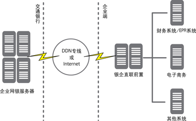 交通银行银企直联系统(以下简称“银企直联”)是交通银行的核心账务系统和企业的内部财务系统(或ERP系统)通过DDN电信专用线或因特网等方式接入的直联电子交易系统。银企直联是企业网银系统的一个组成部分,企业可直接通过其财务系统的界面享受到各项金融服务。