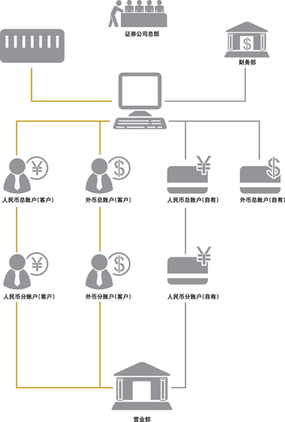 ●账户结构----证券公司的账户分为自有性质账户和客户性质账户。在自有性质账户中,分有人民币账户和外币账户。各证券营业部在当地银行开立人民币自有资金账户,用于存放证券营业部日常运营所需的费用资金;在客户性质账户中,分有人民币账户(A股结算)和外币外币账户(B股结算)。在客户性质的两类账户下,又各自分为总账户和分账户,总账户用于存放总部上收的客户资金,分账户在证券营业部当地银行开立,按照总部统一规划,用于存放各证券营业部日常运营所需的客户资金。